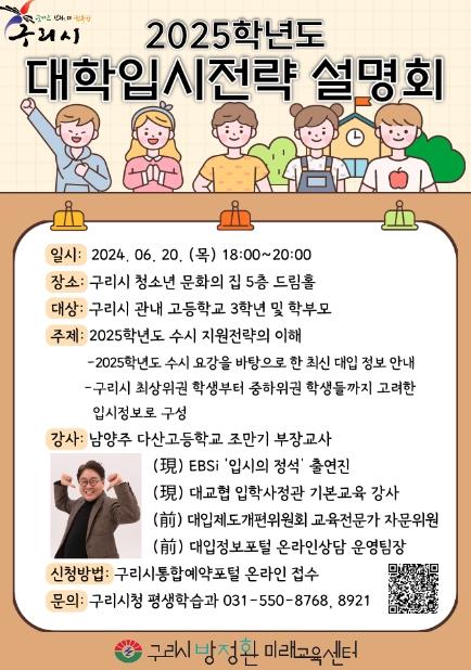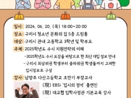 [한국뉴스타임=편집국] 구리시는 오는 6월 20일과 21일 양일간 구리시 청소년 문화의 집 드림홀(5층)에서 관내 대학 입시를 준비하고 있는 고등학생과 학부모를 대상으로 ‘2025학년도 대학 입시전략’ 설명회를 개최한다.