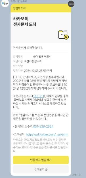 [한국뉴스타임=편집국] 포천시가 오는 9일부터 급여 압류 예고서를 시작으로 각종 체납 관련 안내문을 카카오톡 모바일 전자문서로 발송한다.