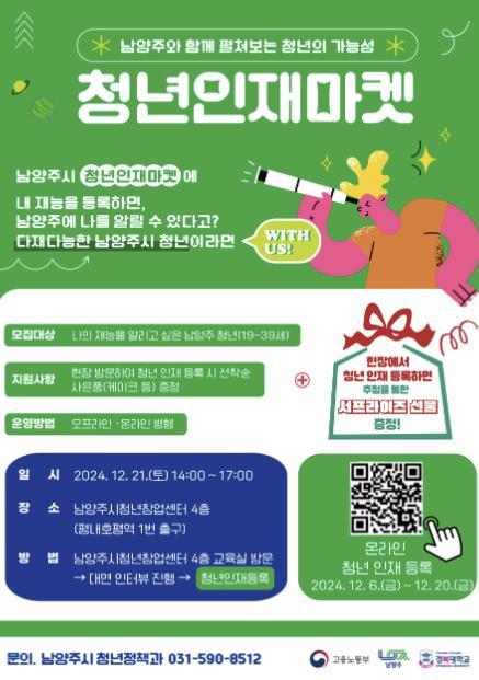 [한국뉴스타임=편집국] 남양주시는 다양한 분야의 숨겨진 청년 인재를 발굴하기 위해 ‘청년인재마켓’ 참여자를 6일부터 21일까지 모집한다.