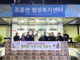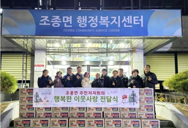 남궁광 조종면장은 “올해 주민자치회가 화목한 식탁 사업, 배추모종심기 봉사 등 다양한 활동을 통해 조종면 발전에 힘써주셔서 감사드린다”며 “기탁해 주신 물품은 도움이 필요한 가구에 소중히 전달하겠다”고 밝혔다.