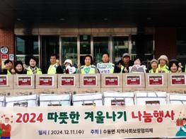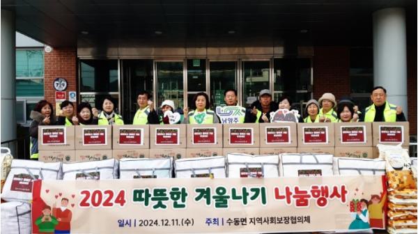 우해덕 수동면장은 “추운 겨울에 돌봄 사각지대에 놓인 이웃들의 건강과 안전을 위해 나눔을 실천해주신 지역사회보장협의체의 선행에 감사드린다”며 “앞으로도 우리 주변의 어려운 이웃을 돌아보고 관심과 지원을 쏟을 수 있도록 최선을 다하겠다”고 전했다.