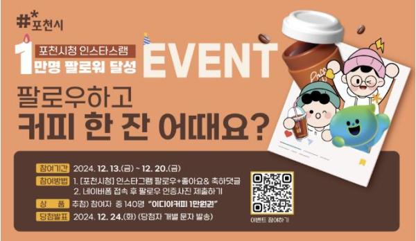이번 이벤트는 시민의 관심에 보답하고, 시민과의 소통을 위해 마련됐다. 이벤트 참여는 포천시청 인스타그램 계정을 팔로우한 후, 팔로우 화면을 캡처해 네이버폼 링크에 등록하면 된다. 이벤트 게시글에 ‘좋아요’와 댓글 작성도 필수다. 당첨자는 오늘 24일 발표된다.