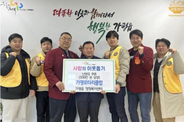 [한국뉴스타임=편집국] 가평로타리클럽은 16일 가평읍 행정복지센터를 방문해 500만 원 상당의 난방유 쿠폰을 전달했다.