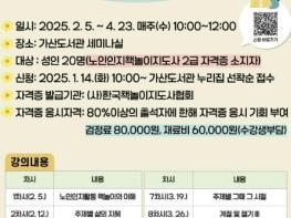 과정은 오는 2월 5일부터 4월 23일까지 총 12차시로 진행되며, 노인인지책놀이지도사 2급 자격증을 소지한 성인이라면 누구나 참여할 수 있다. 80% 이상 출석한 참여자에게는 노인인지책놀이지도사 1급 시험에 응시할 자격이 부여된다.