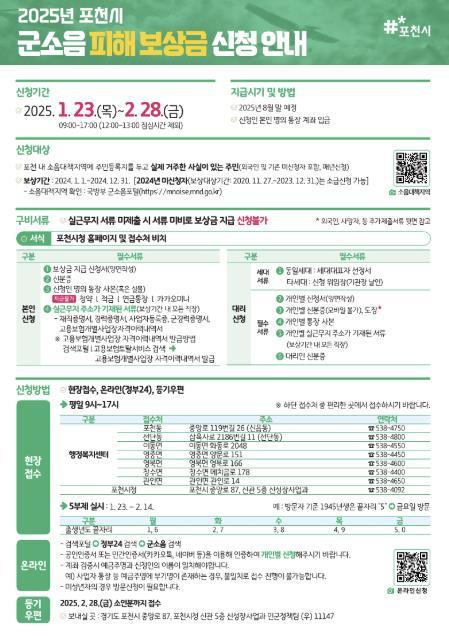 신청 대상자는 2024년 1월 1일부터 12월 31일까지 포천시 내 소음대책지역에 주민등록을 두고 실거주한 주민(외국인 포함)이다. 매년 신청해야 하며, 기존 미신청자도 소급 신청이 가능하다. 보상대상지 조회는 ‘국방부 군소음포털’을 통해 확인할 수 있다.
