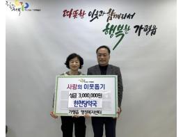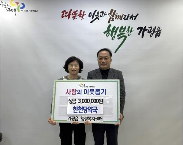[한국뉴스타임=편집국] 가평군 가평읍은 지난 17일 한천당약국에서 가평읍행정복지센터에 이웃돕기 성금 300만 원을 기탁했다고 밝혔다.