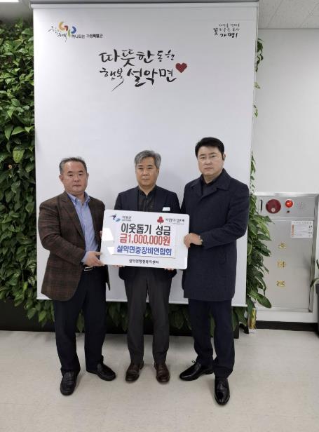 권혁 설악면중장비연합회장은 “회원들과 뜻을 모아 성금을 기탁하게 됐다”며 “다가오는 설 명절에 어려운 이웃들이 따뜻함을 느낄 수 있기를 바란다”고 전했다.