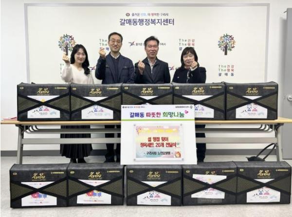 이날 구리시립노인요양원 관계자들은 남상익 갈매동장에게 한우 국거리와 사골곰탕 20세트를 전달했으며, 이 후원물품은 갈매동 내 저소득층과 홀로 어르신들 가정에 배부할 예정이다.