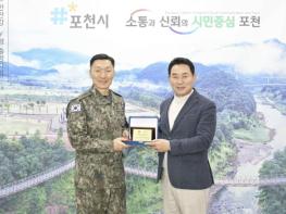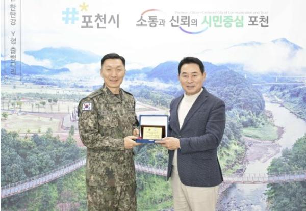 이날 고창준 육군참모총장 직무대리 대신 김성민 제5군단장이 직접 시청을 방문해 백영현 포천시장에게 감사패를 전달했다.