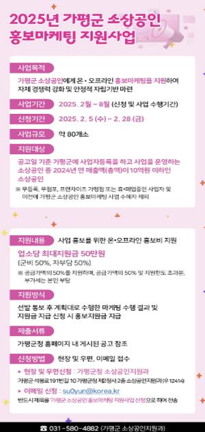 [한국뉴스타임=편집국] 가평군이 지역 소상공인의 경영 부담 완화를 위해 ‘2025년 가평군 소상공인 홍보마케팅 지원사업’을 실시한다. 신청 접수는 이달 28일까지 하면 된다.