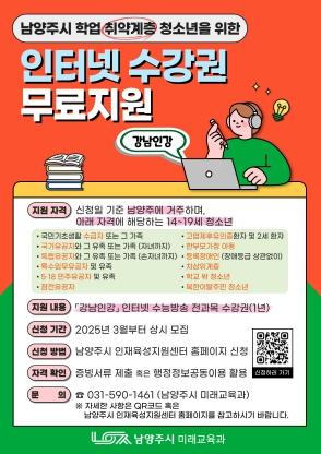 또한 △기초수급자 △차상위계층 △국가유공자 △한부모가정 아동 △장애인 △학교 밖 청소년 등 취약계층 청소년은 남양주시 인재육성지원센터 누리집을 통해 3월부터 신청하면 된다.