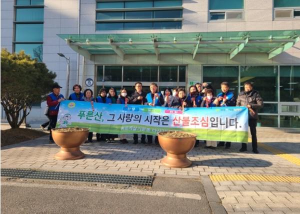 회의 이후 위원 10여 명은 황금산을 방문해 주요 등산로 주변 수목에 산불 예방 리본을 직접 설치했으며, 나머지 위원들은 주민센터 인근에서 시민들에게 ‘산불 조심’ 문구가 적힌 물티슈를 배부하며 산불 예방의 중요성을 적극 홍보했다.
