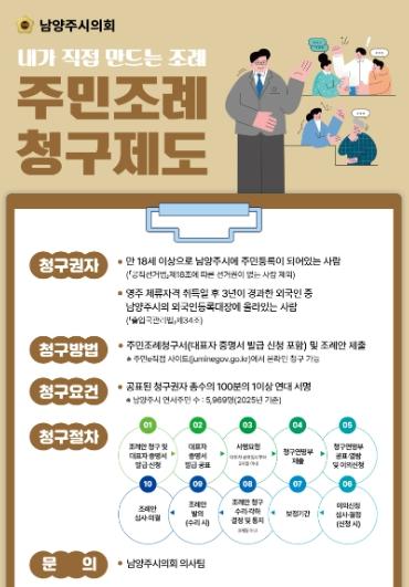 [한국뉴스타임=편집국] 남양주시의회는 주민이 직접 조례의 제정, 개정, 폐지를 청구할 수 있는 주민조례청구 제도의 활성화를 위해 대시민 홍보를 강화할 계획이라고 밝혔다.