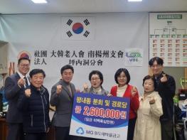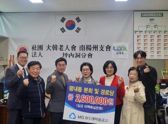 [한국뉴스타임=편집국] 남양주시 화도새마을금고는 (사)대한노인회 남양주시지회 평내분회에 후원금 260만 원을 기탁하며 지역 어르신 복지를 위한 나눔을 실천했다.