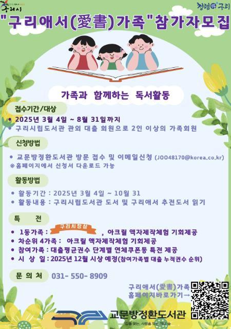 백경현 구리시장은 “교문방정환도서관이 독서를 기반으로 가족 간의 소통과 유대감을 높이고자 마련된 본 프로그램을 통해 책과 함께 성장하며 가족과 함께 소중한 시간을 보내고 뜻깊은 추억을 만드는 기회가 되길 바란다.”라고 말했다.