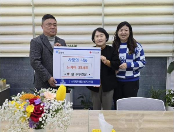 이계향 선단동장은 “이웃을 향한 따뜻한 나눔을 실천해 주신 두두건설에 감사드린다”며, “기부해 주신 후원 물품은 이웃을 생각하는 마음과 함께 필요한 가정에 잘 전달하겠다”고 말했다.