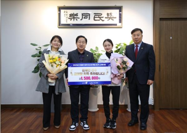 [한국뉴스타임=편집국] 남양주시는 6일, 시장 집무실에서 2025년 제9회 하얼빈 동계 아시안게임 피겨스케이팅 여자 싱글 금메달을 획득한 김채연 선수에게 포상금 150만 원을 전달했다.
