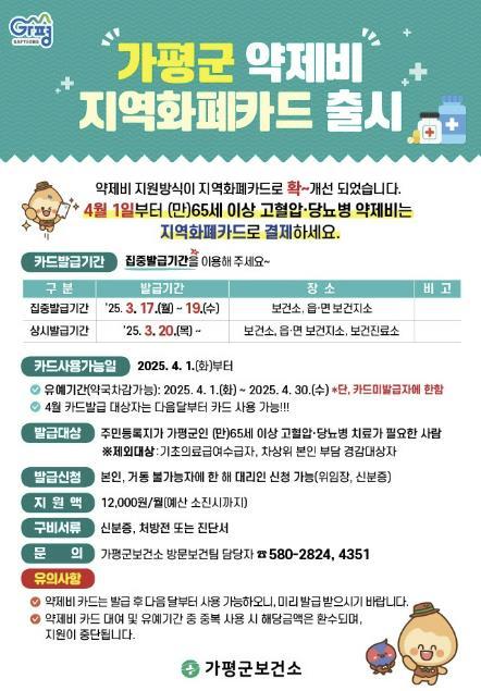 군은 현재 65세 이상 고혈압‧당뇨병 환자에게 매월 1만2,000원의 약제비를 지원하고 있는데, 4월 1일부터 기존의 약국 차감 방식에서 ‘가평군 약제비 지역화폐카드’ 결제 방식으로 변경된다. 이에 따라 모든 지원 대상자는 약국 방문 전에 반드시 가평군 약제비 지역화폐카드를 발급받아야 한다.