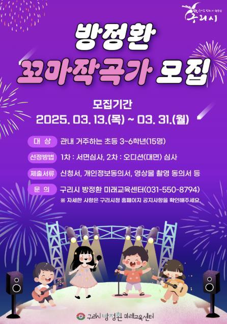 ‘방정환 꼬마작곡가’ 2기는 구리시에 거주하는 초등학교 3~6학년이면 누구나 교육에 참여할 수 있으며, 음악이나 악기를 배운 적이 없어도 세상의 아름다운 소리를 음악으로 느끼고 자신의 이야기로 곡을 만들어 표현하는 창의형 음악교육으로 3월 13일부터 31일까지 모집한다.