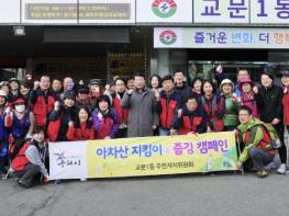 이날 교문1동주민자치위원들과 지역 단체회원 30명이 함께 아차산 엄마약수터와 정각사 등산로를 돌며 쓰레기를 줍는 환경정화 활동과 산불 예방 캠페인을 펼쳤다.