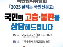 [한국뉴스타임=편집국] 가평군은 오는 27일 국민권익위원회와 함께 가평군청에서 ‘달리는 국민신문고’를 운영한다고 밝혔다. 군은 이날 군민들이 생활 속 고충을 해소할 수 있도록 적극적인 참여를 당부했다.