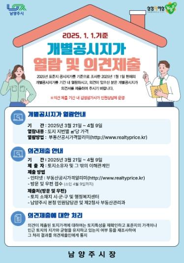 [한국뉴스타임=편집국] 남양주시는 개별공시지가에 대한 신뢰도를 높이기 위해 의견제출(3월 21일부터 4월 9일까지) 및 이의신청 기간(4월 30일부터 5월 29일까지) ‘감정평가사 민원 상담제’를 운영한다.