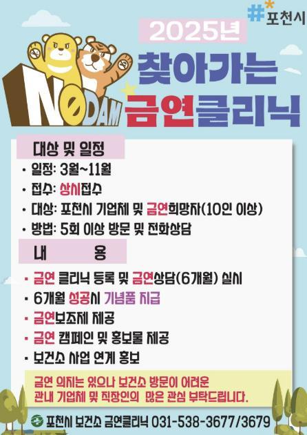 박은숙 포천시 보건소장은 “관내 사업체 또는 기관 흡연자들의 금연을 돕기 위해 ‘찾아가는 금연클리닉’이 운영되고 있다”며, “많은 기관이 참여해 건강한 직장 문화를 함께 만들어가길 바란다”고 말했다.