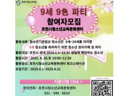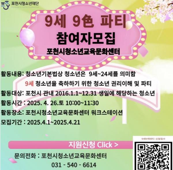 [한국뉴스타임=편집국] 재단법인 포천시청소년재단 포천시청소년교육문화센터는 오는 4월부터 청소년의 권리 이해와 9세 청소년의 성장을 축하하는 ‘9세 9色 파티’ 프로그램 참가자를 모집한다.