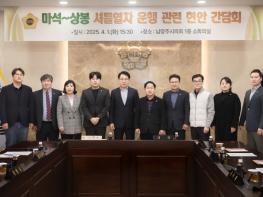 이날 간담회는 마석-상봉 셔틀열차 개통 추진 상황을 점검하고, 5월 정상 개통을 위한 의회와 집행부 간 협력방안에 대해 논의하고자 마련됐으며, 조성대 남양주시의회 의장과 박경원 도시교통위원장, 김지훈(민) 부위원장, 이상기 의원, 김지훈(국) 의원, 김영실 의원, 이진환 의원, 이수련 의원, 김상수 의원을 비롯해 주광덕 남양주시장과 관계 공무원들이 참석했다.