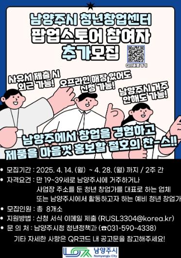 [한국뉴스타임=편집국] 남양주시가 4월 14일부터 28일까지 2주간, 청년창업센터 팝업스토어 참여 사업자를 추가 모집한다.