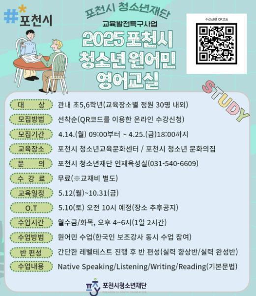 [한국뉴스타임=편집국] 포천시청소년재단은 오는 5월부터 청소년의 글로벌 역량 강화를 위한 ‘2025 포천시 청소년 원어민 영어교실’을 본격 운영한다.