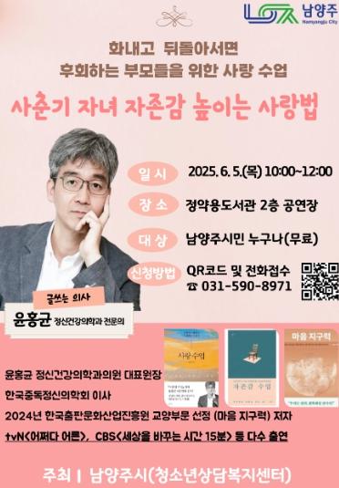 윤홍균 원장은 tvN '어쩌다 어른', CBS '세상을 바꾸는 시간 15분' 등 다양한 매체를 통해 대중과 활발히 소통해 온 전문가로, 이번 강연에서는 청소년기의 불안정한 자존감을 지지하고 회복력 있는 자녀로 성장시키는 실질적인 방법을 중심으로 강연을 펼칠 예정이다.