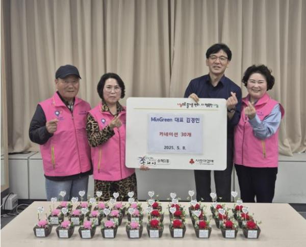 [한국뉴스타임=편집국] 구리시 수택1동행정복지센터는 5월 8일 김경민 ‘Min Green’ 대표의 재능기부로 사랑의 카네이션 화분 30개를 기탁받았다.