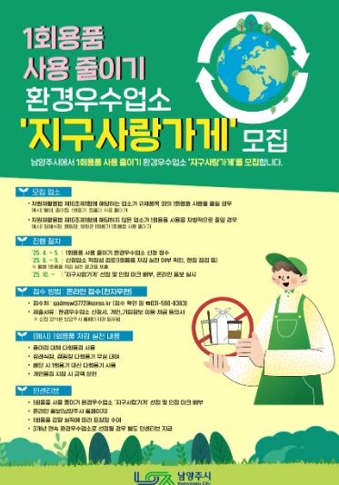 [한국뉴스타임=편집국] 남양주시는 오는 30일까지, 시민들의 1회용품 줄이기 자발적 실천을 유도하기 위해 ‘지구사랑가게’ 환경 우수 업소를 모집한다.