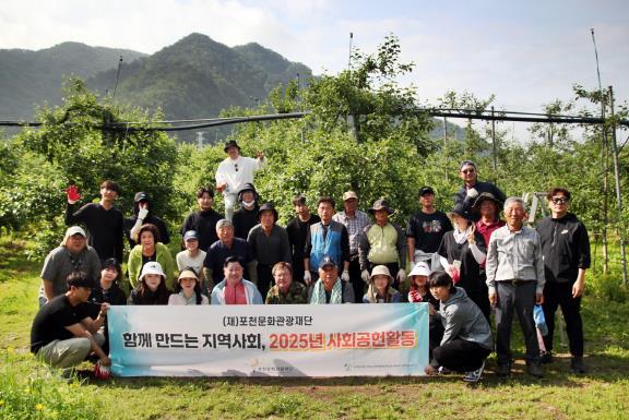 (재)포천문화관광재단은 지난 21일 포천시 영중면 소재 과수농가에 방문해 영농철 일손이 부족한 농가를 지원하는 봉사활동 ‘포밍데이’를 진행했다.