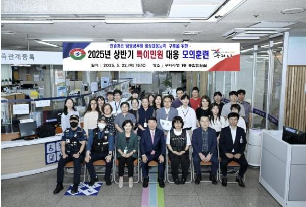 [한국뉴스타임=편집국] 구리시는 폭언·폭행 등 악성민원으로부터 담당 공무원을 보호하고 안전한 민원 환경을 조성하기 위해 지난 22일 구리시청 1층 종합민원실에서 구리경찰서와 합동으로‘2025년 상반기 특이민원 발생 대비 모의훈련’을 실시했다.