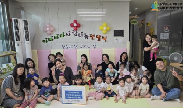 [한국뉴스타임=편집국] 남양주시는 지난 21일, 산들다산어린이집이 ‘아나바다 산들다산마켓’을 통해 마련한 수익금 100만 원을 서부희망케어센터에 기탁했다고 밝혔다.
