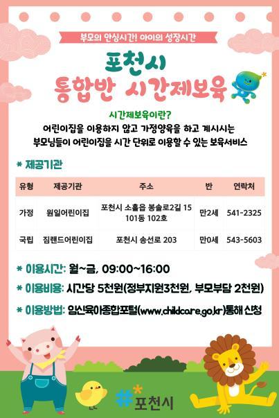 백영현 포천시장은 “이번 시간제 보육 통합반 운영은 포천의 모든 아이가 돌봄 공백 없이 보육 받을 수 있도록 보육 사각지대를 해소하기 위한 정책”이라며, “앞으로도 다양한 보육 수요에 맞춘 공공 보육 서비스를 확대해 부모와 아이가 안심하고 살아갈 수 있는 행복한 포천을 만들겠다”고 말했다.