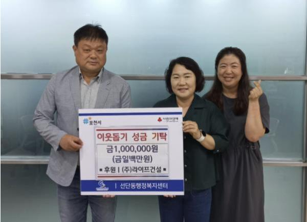 [한국뉴스타임=편집국] ㈜라이프건설은 지난 20일 지역의 어려운 이웃을 돕기 위한 성금 100만 원을 포천 선단동 행정복지센터에 기부했다.