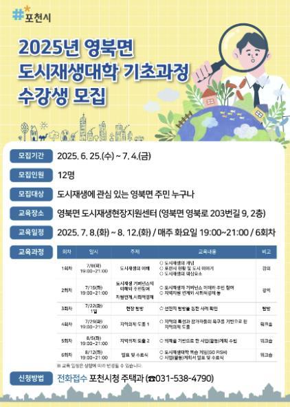 [한국뉴스타임=편집국] 포천시는 오는 7월 4일까지 ‘2025년 영북면 도시재생대학 기초과정’ 수강생을 모집한다.