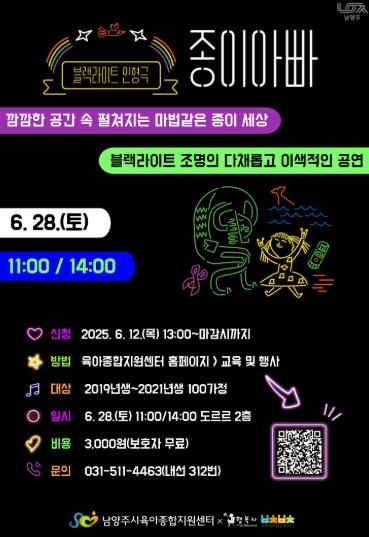 이번 공연은 체험과 이머시브(몰입형) 요소가 결합된 블랙라이트 공연으로, 영유아와 보호자가 함께 즐기며 놀이와 문화를 자연스럽게 접할 수 있도록 기획됐으며, 오전 11시와 오후 2시, 총 2회에 걸쳐 영유아 가정 100가정을 대상으로 진행될 예정이다.