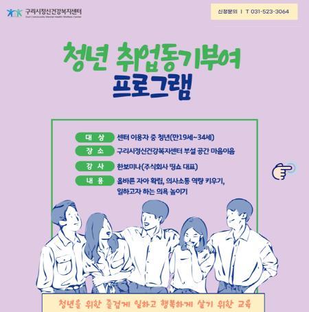 [한국뉴스타임=편집국] 구리시정신건강복지센터는 구리시정신건강복지센터를 이용하는 청년들을 대상으로‘청년 취업 동기 부여’프로그램을 성료했다고 밝혔다.