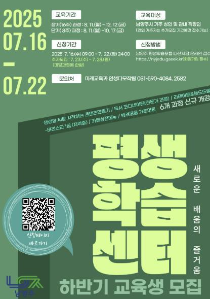 [한국뉴스타임=편집국] 남양주시는 이달 16일부터 22일까지 2025년 하반기 평생학습센터 교육생을 모집한다고 밝혔다.