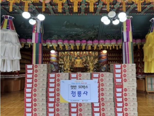 [한국뉴스타임=편집국] 가평군 청평면에 위치한 사찰 청룡사는 15일 가평읍에 이웃돕기 햇반 50박스를 기탁했다.