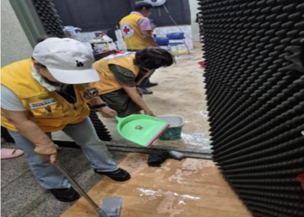 대한적십자사 구리시협의회 소속 봉사자들은 현장을 찾아 배수 작업, 오염된 물품 정리 및 청소, 침수된 장판과 속지 제거 후 건조 작업을 실시하여 실질적인 복구 작업에 힘을 보탰다.