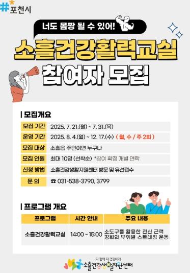 [한국뉴스타임=편집국] 포천시는 주민의 체력 향상과 건강한 생활습관 형성을 위해 운영되는 '소흘건강활력교실'의 참여자를 모집한다.