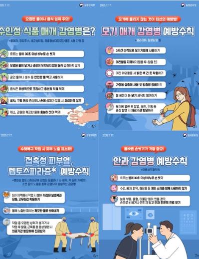 또한 모기 매개 감염병 예방을 위해 방충망 점검, 기피제 사용, 야간 활동 자제 등을 권고했다. 접촉성 피부염 예방을 위해서는 침수 지역 복구 시 장갑·방수복을 착용해 피부 노출을 최소화해야 한다.