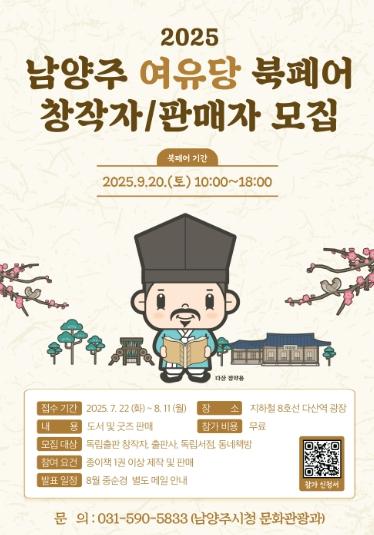 [한국뉴스타임=편집국] 남양주시는 9월 20일 다산역 광장에서 열리는 ‘2025 남양주 여유당 북페어’에 참가할 창작자와 판매자를 7월 22일부터 8월 11일까지 모집한다.