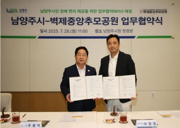 [한국뉴스타임=편집국] 남양주시는 28일 시청 청렴방에서 벽제중앙추모공원과 시민 장사(葬事)복지 향상 및 장례 편의 개선을 위한 업무협약(MOU)을 체결했다.