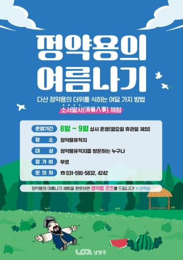 시 관계자는 “‘소서팔사’를 시민들이 직접 체험할 수 있도록 구성한 만큼, 여름철 색다른 프로그램이 될 것으로 기대한다”며 “앞으로도 정약용유적지만의 특색 있는 콘텐츠를 지속적으로 개발해 나갈 것”이라고 말했다.